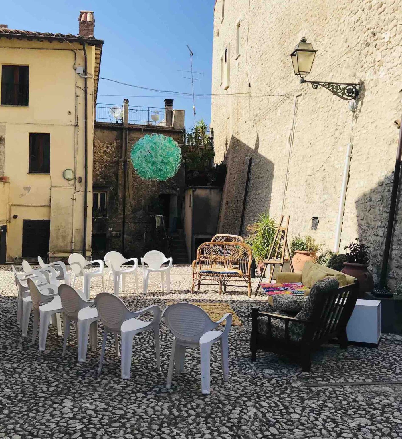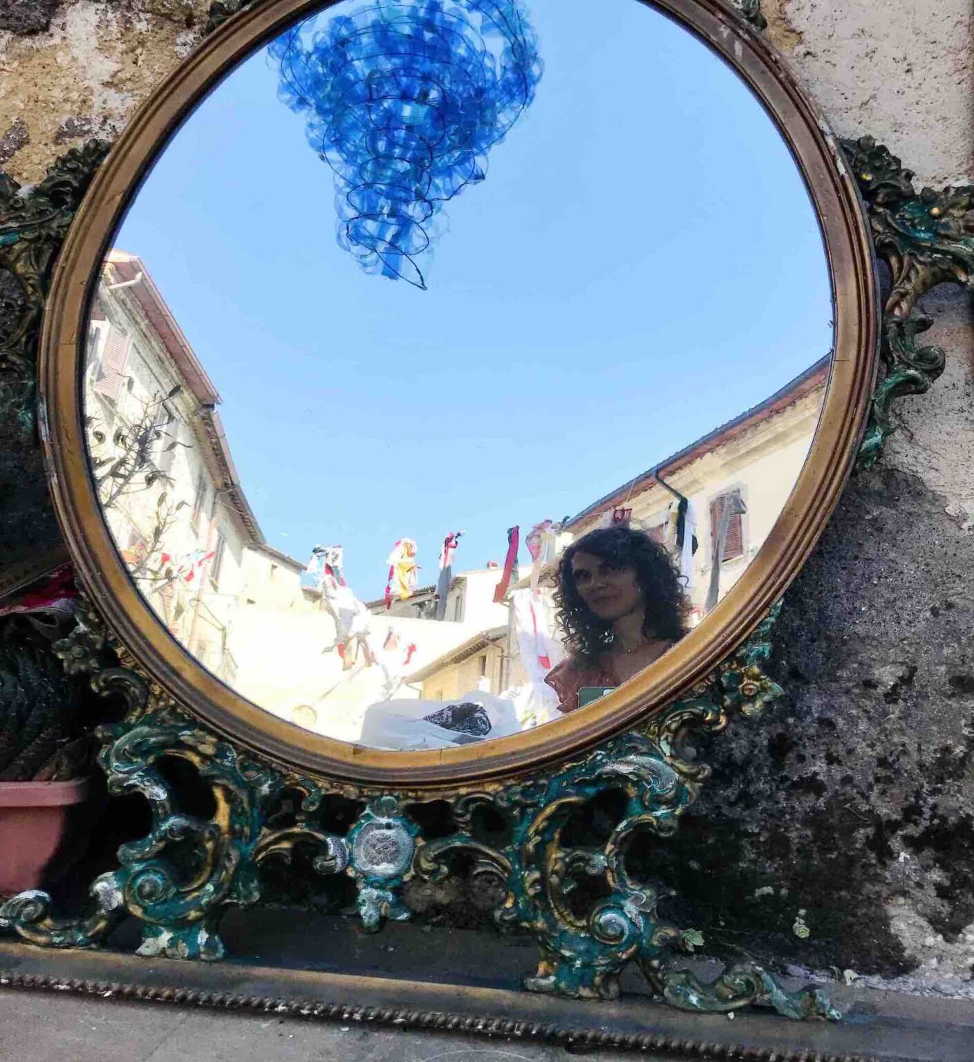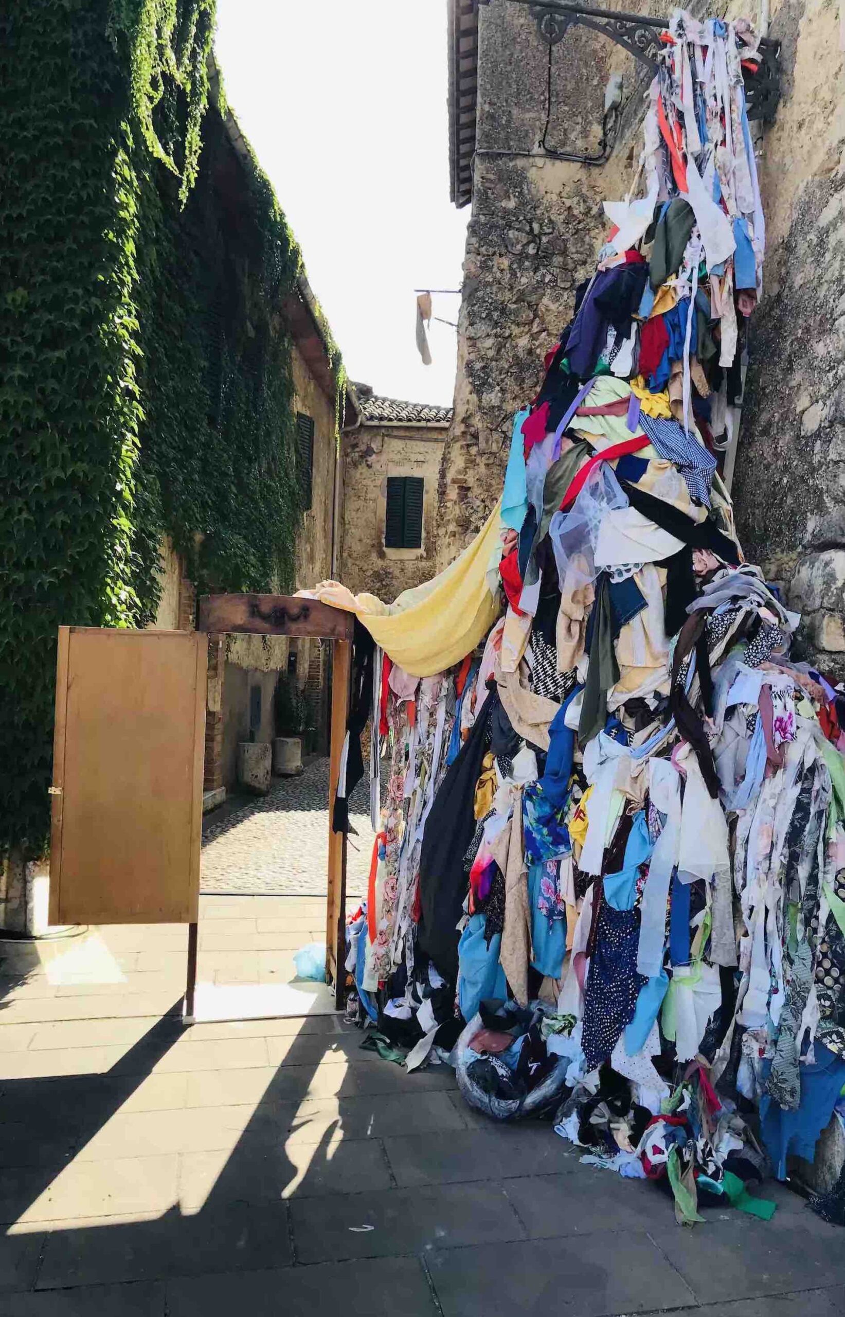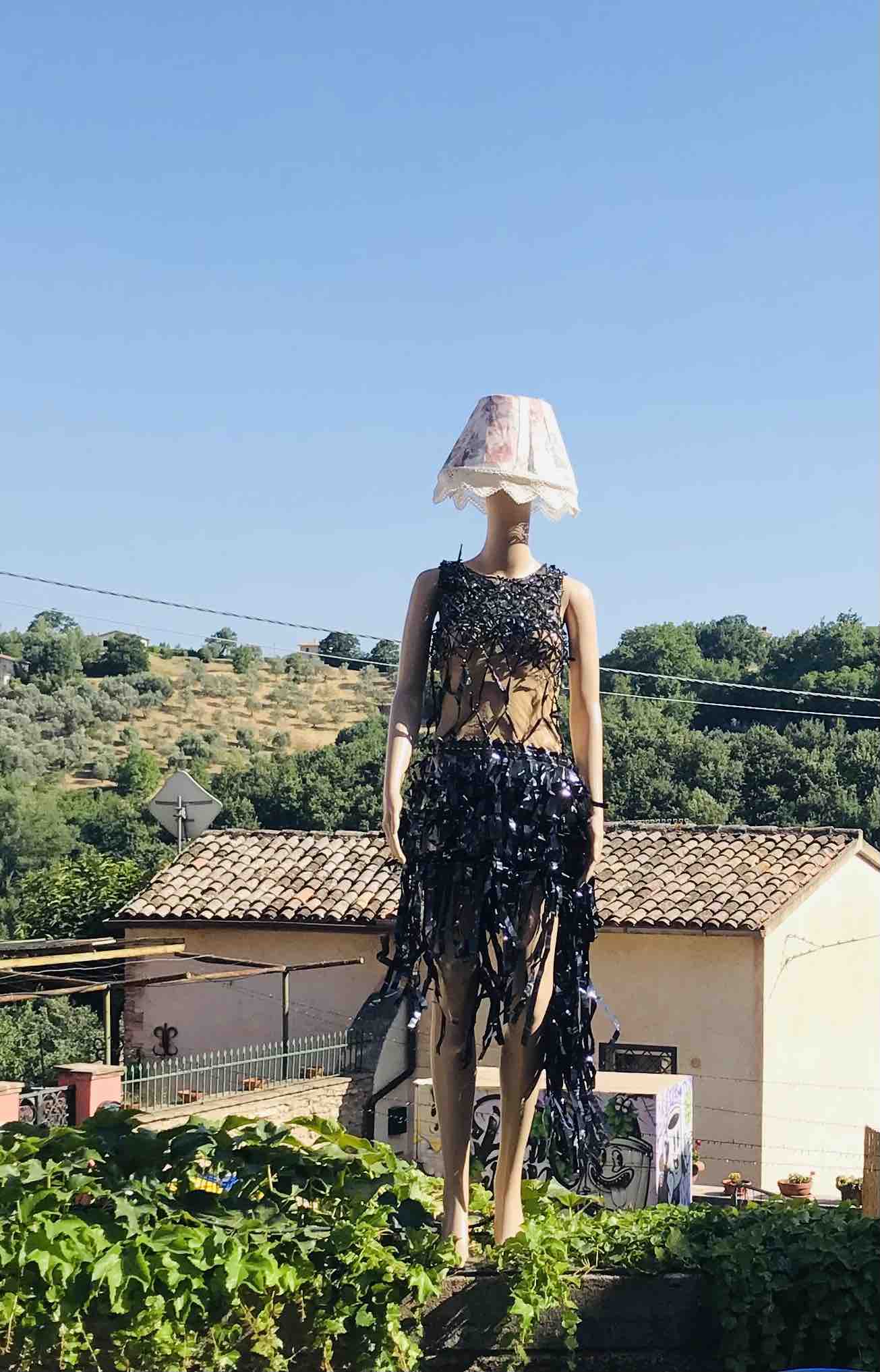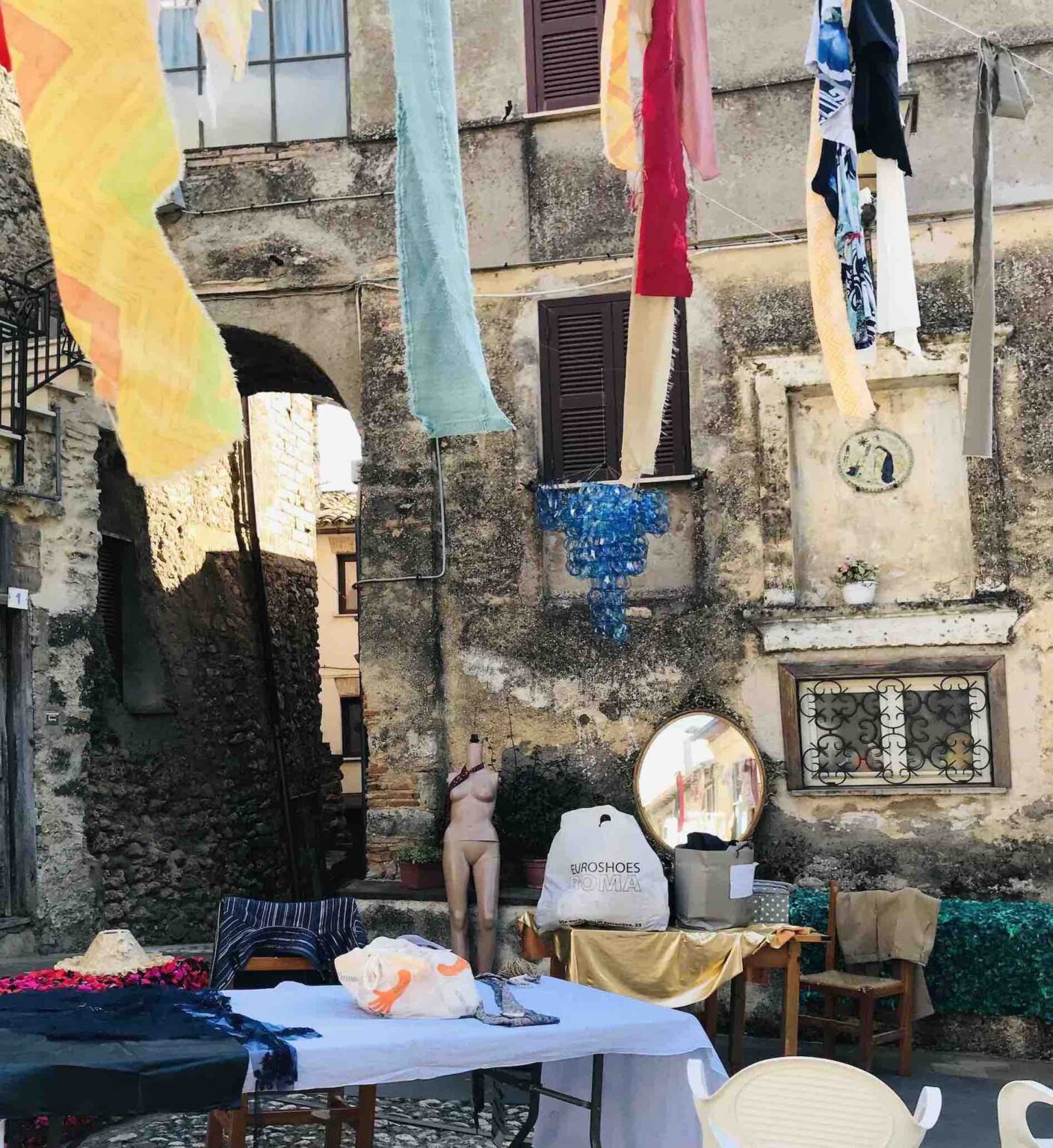 Every year, Frasso Sabino welcomes us with a setting carefully decorated with reused scrap materials by the Pro Loco Frasso, helped by friends and volunteers. This year, the wind-swept fabric scraps, a textile monument reminiscent of the “Venus of the Rags,” mannequin chandeliers, and wardrobes serving as doors strongly emphasize the theme of sustainable fashion.